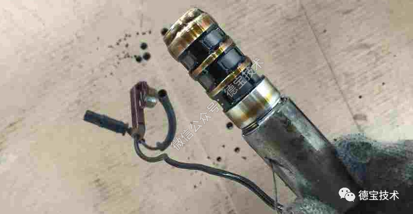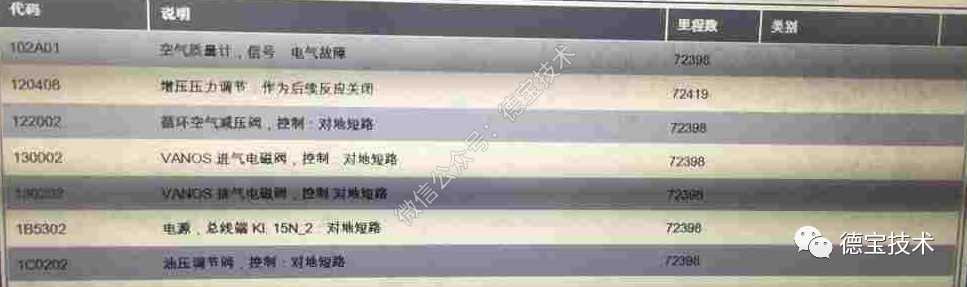 6.当插上油压调节器插头时发动机有出现故障灯点亮。通过电脑测试有:空气流量计、增压压力调节阀、进排VANOS电磁阀、油压调节器故障码。