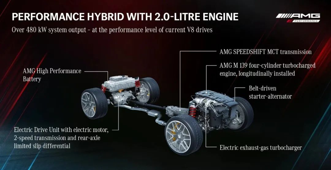 前轴M139发动机由原来的横置变为纵置,重新匹配9速纵置变速箱,同时配备电动涡轮增压器,后轴是一台150千瓦的驱动电机,这套混动系统最终可以输出超过480千瓦的综合功率,而且这样的搭配也会有个明显的好处,那就是改变当前奔驰C63前后配重不均的情况。