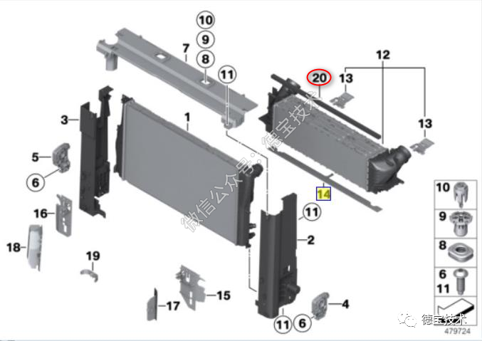 7.那么只有可能是风扇前后部件引起的风噪声了。考虑到之前前部做过事故,该车会不会是哪个地方没装好?刚好有现成的车做对比,重新拆掉电子风扇,仔细的观察,终于发现了一个不一样的地方。故障车的上部水箱和下部中冷器之间少了一块塑料板。下图中的“20”。把该块塑料板装到故障车上,故障车就好了,异响成功转移。