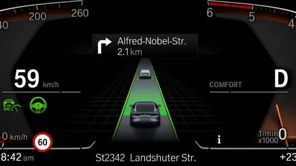 b、转弯优化:如果BMW 自动驾驶辅助系统 Pro 处于简化模式,车道偏离警告系统会在你接近车道边缘(例如在弯道内侧)时识别出来,然后减少车道纠偏误触发。