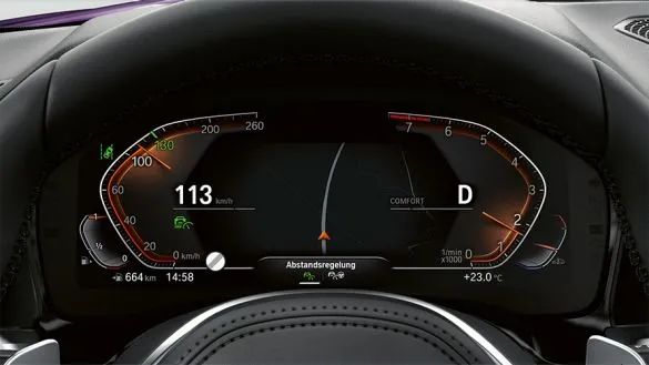 当在使用主动巡航控制系统(ACC)驾驶时,组合仪表会显示你的BMW所探测的交通状况。即使有雾,周围交通环境也能尽收眼底。